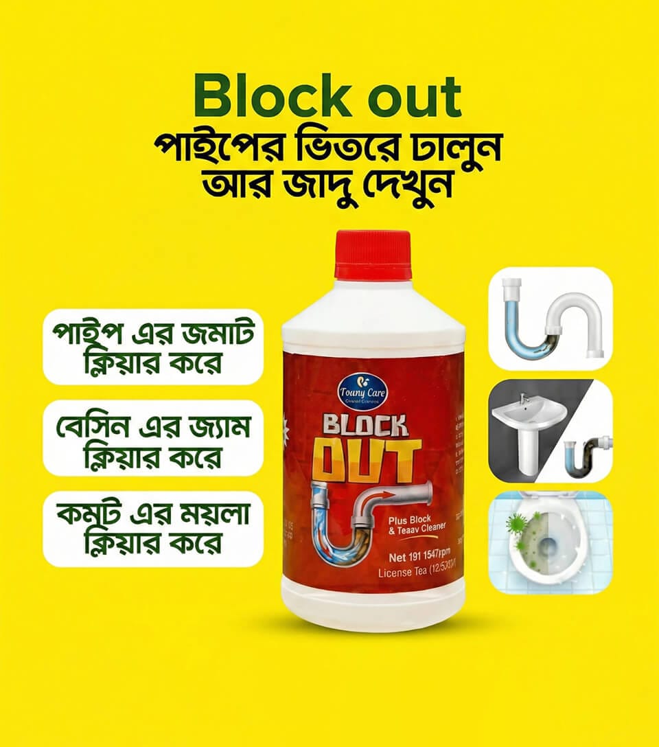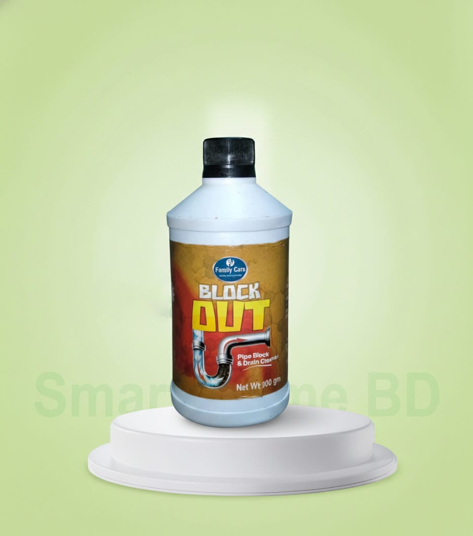 ব্লক আউট (Block Out) Drain Cleaner পাইপের ভেতরে জমে থাকা চর্বি, চুল, খাবারের বর্জ্য ও অন্যান্য জমাট ময়লা দ্রুত গলিয়ে ড্রেন পরিষ্কার করে। সিঙ্ক, বাথরুম ও কিচেনের ব্লকেজ দূর করে পানি নামার রাস্তা স্বাভাবিক রাখে এবং দুর্গন্ধ কমাতে সহায়তা করে।